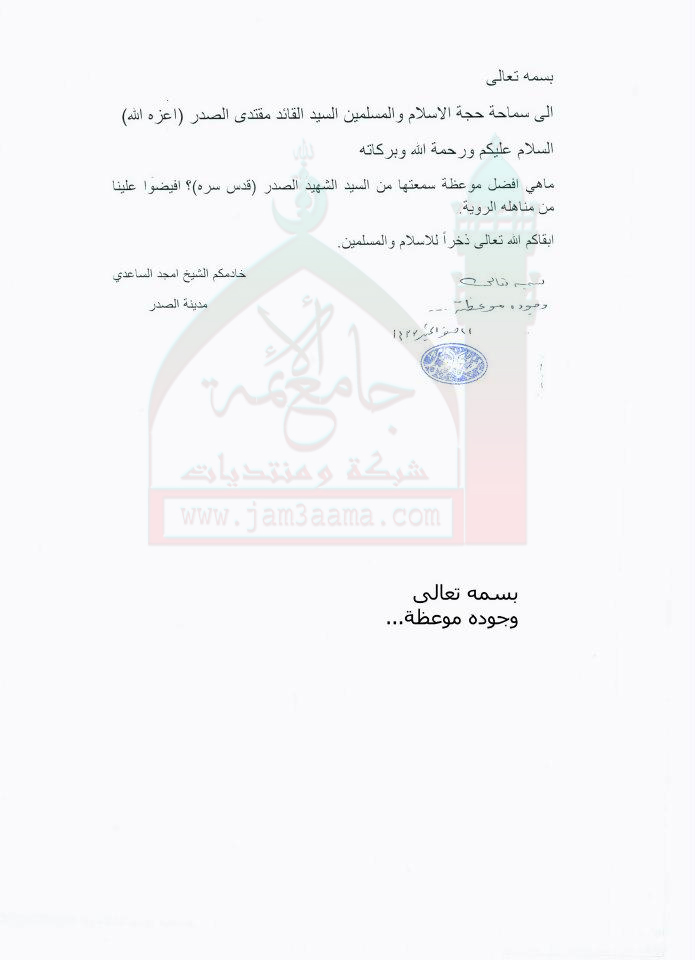 افضل موعظة سمعتها من السيد الشهيد الصدر قدس سره استفتاء السيد القائد مقتدى الصدر اعزه الله 16 - 1 - 2012