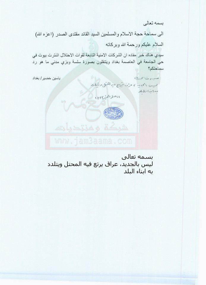شراء الشركات الامنية التابعة للاحتلال الامريكي لبيوت في حي الجامعة -بغداد استفتاء السيد القائد مقتدى الصدر اعزه الله 16 - 1 - 2012