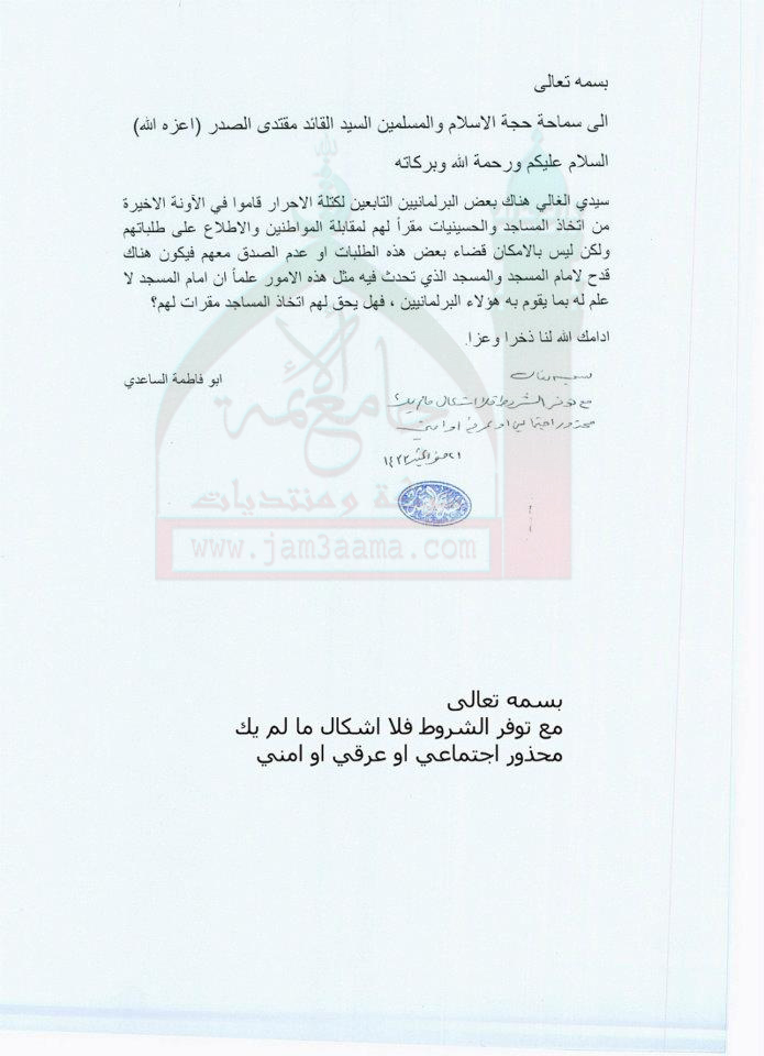 اتخاذ برلماني كتلة الاحرار للمساجد والحسينيات مقارا لهم لمقابلة المواطنين استفتاء السيد القائد مقتدى الصدر اعزه الله 16 - 1 - 2012