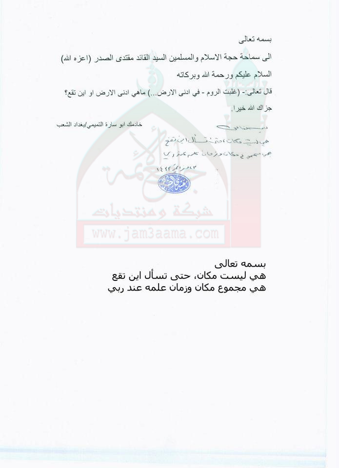 ادنى الارض الواردة في الاية "غلبت الروم في ادنى الارض...." استفتاء السيد القائد مقتدى الصدر اعزه الله 18 - 1 - 2012