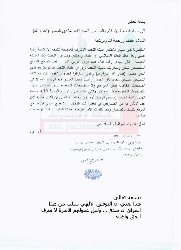 اغفال ذكر اسمي الشهيدين الصدرين رض في موقع "النجف الاشرف كعاصمة للثقافة الاسلامية" استفتاء السيد القائد مقتدى الصدر اعزه الله 18 - 1 - 2012