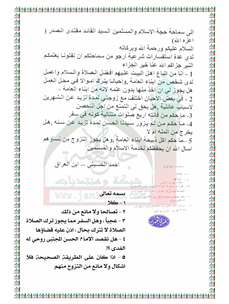 خمس استفسارات شرعية ( العمل مع ابناء العامة - التمتع - فوت الصلاة في السفر .... ) استفتاء سماحة السيد القائد مقتدى الصدر اعزه الله 10 - 2010