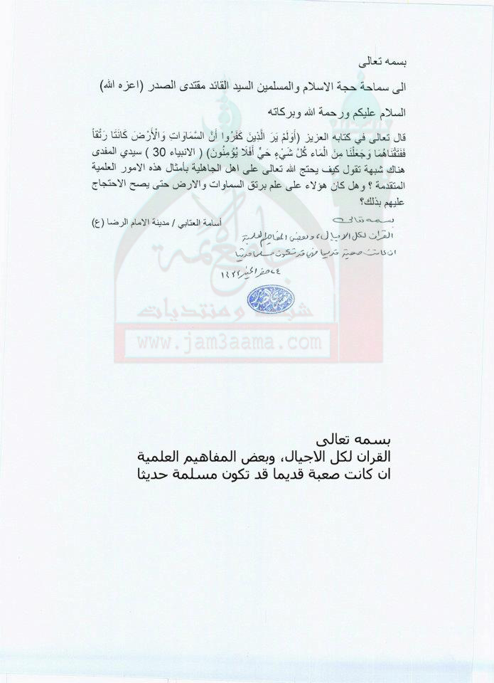 {أَوَلَمْ يَرَ الَّذِينَ كَفَرُوا أَنَّ السَّمَاوَاتِ وَالْأَرْضَ كَانَتَا رَتْقاً فَفَتَقْنَاهُمَا }الأنبياء 30 استفتاء السيد القائد مقتدى الصدر اعزه الله 20-1-2012