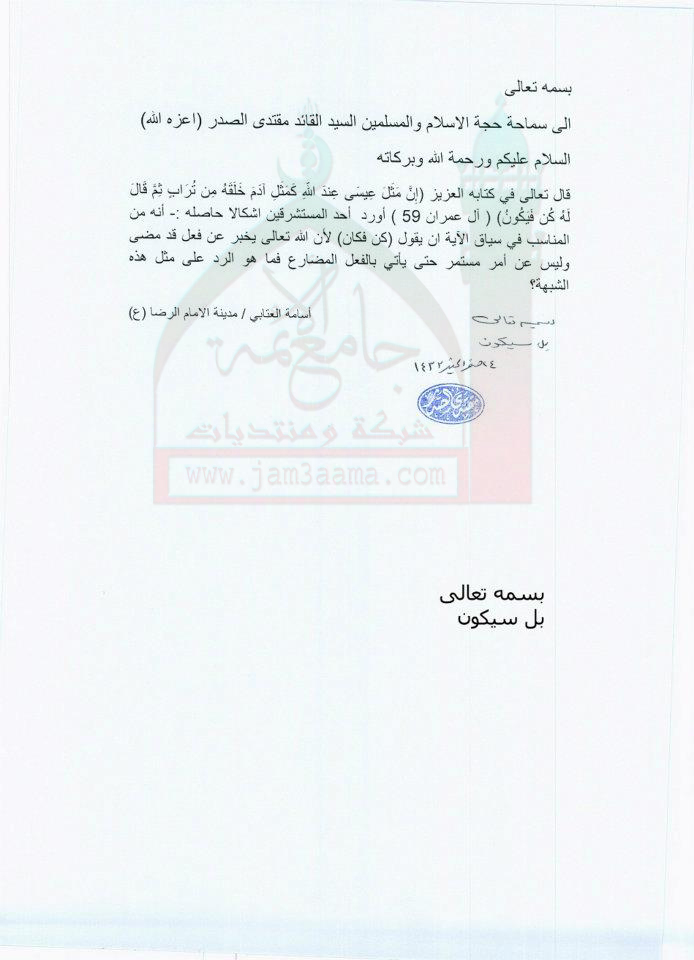 الاية"ان مثل عيسى عند الله كمثل ادم...." استفتاء السيد القائد مقتدى الصدر اعزه الله 20 - 1 - 2012