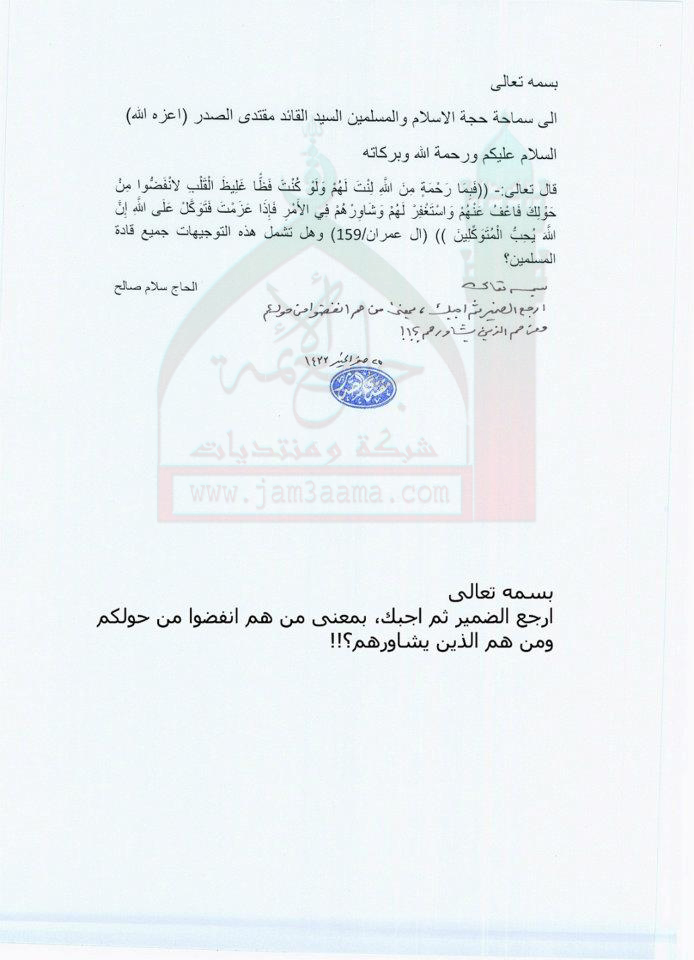 الاية "فبما رحمة من الله لنت لهم ...."وشمولها لجميع قادة المسلمين!! استفتاء السيد القائد مقتدى الصدر اعزه الله 21-1-2012