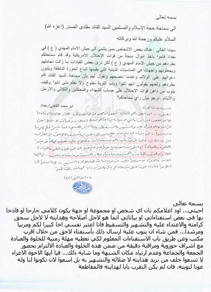لمن شاء التوبة من المفسدين وكيفية التواصل معهم استفتاء السيد القائد مقتدى الصدر اعزه الله 22- 1 - 2012