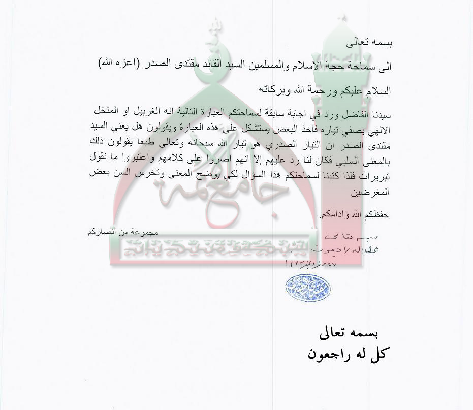 استشكال البعض على قول سماحته ان الغربيل او المنخل الالهي يصفّي تياره استفتاء السيد القائد مقتدى الصدر اعزه الله 24- 1 - 2012