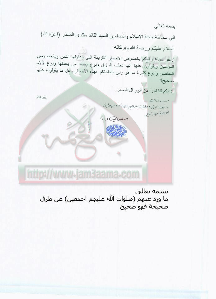 ما ورد عن المعصومين ع في الاحجار الكريمة عن طرق صحيحة فهو صحيح استفتاء السيد القائد مقتدى الصدر اعزه الله 24 - 1 - 2012