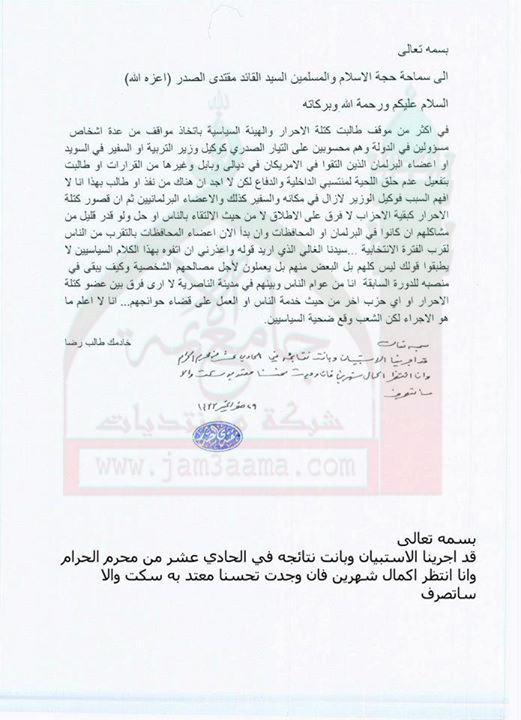 التماهل في اصلاح القصورات للسياسيين الصدريين استفتاء السيد القائد مقتدى الصدر اعزه الله 24 - 1 - 2012