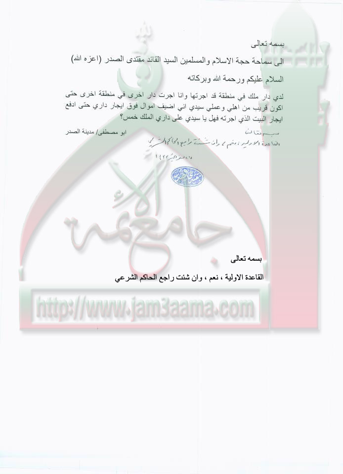 هل على الدار الملك المؤجرة خمس استفتاء السيد القائد مقتدى الصدر اعزه الله 25-1-2012