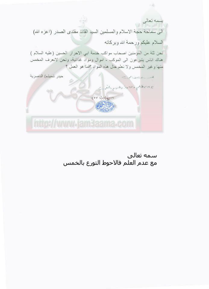 الاموال والمواد الغذائية المتبرع بها للمواكب الحسينية غير المخمسة استفتاء للسيد القائد مقتدى الصدر اعزه الله 27 - 1 - 2012
