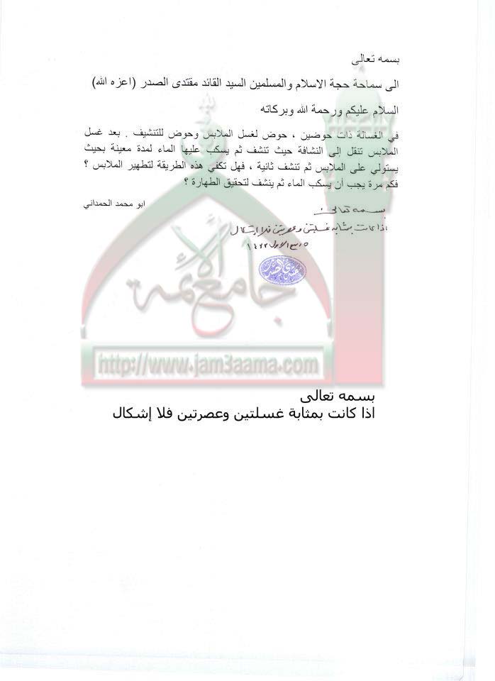 تطهير الملابس في الغسّالة استفتاء السيد القائد مقتدى الصدر اعزه الله30 - 1 - 2012