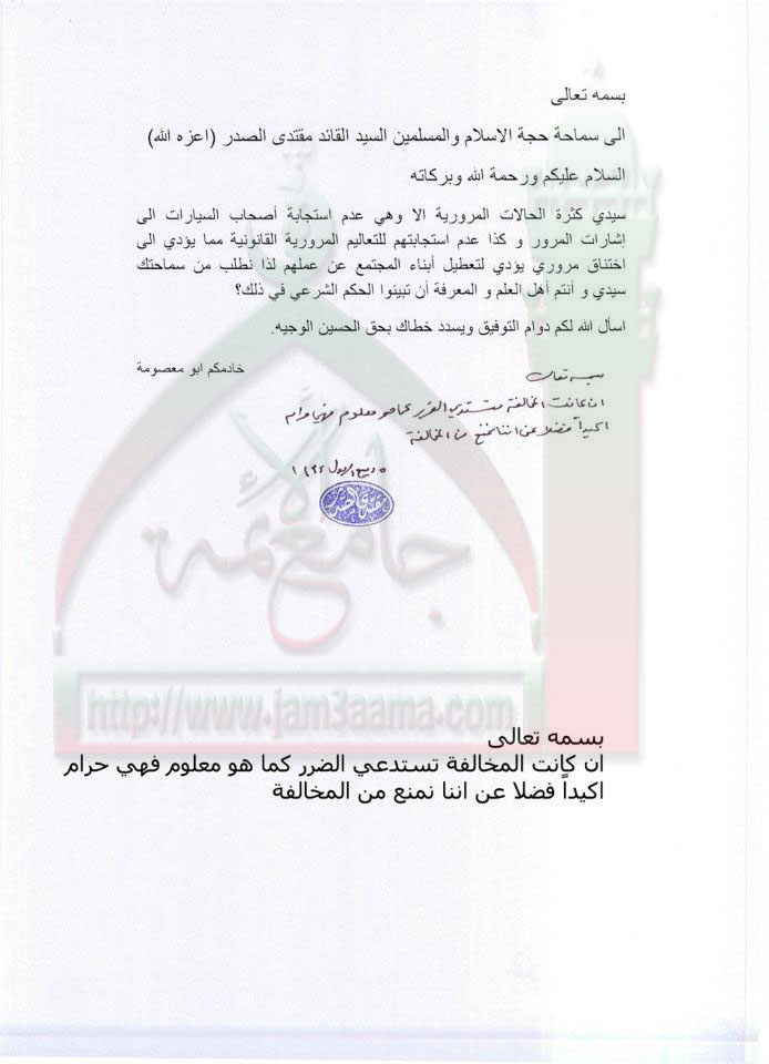 عدم التزام سائقي المركبات بالاشارات المرورية استفتاء السيد القائد مقتدى الصدر اعزه الله 30 - 1 - 2012