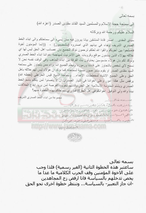 وجوب ايقاف الحرب الكلامية ضد - المنشقين العصائب - استفتاء السيد القائد مقتدى الصدر اعزه الله 31-1-2012