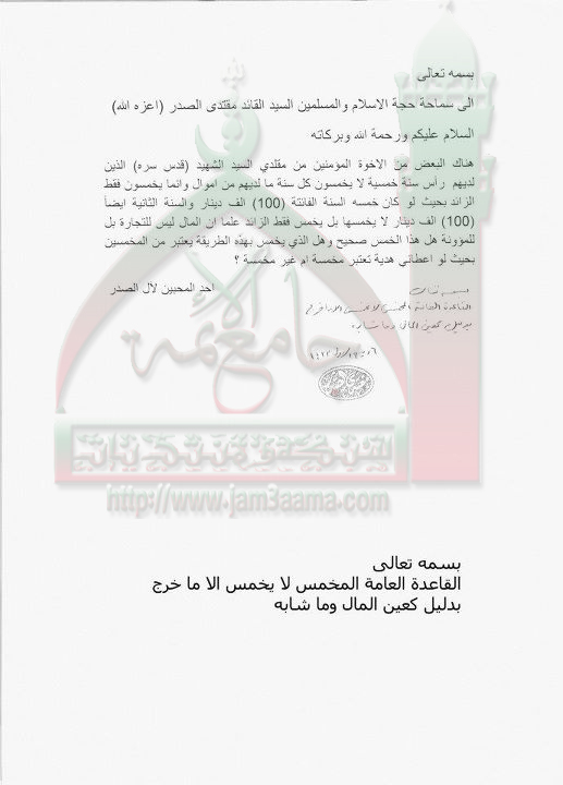 المخمس لا يخمس الا ما خرج بدليل كعين المال استفتاء السيد القائد مقتدى الصدر اعزه الله 31-1-2012