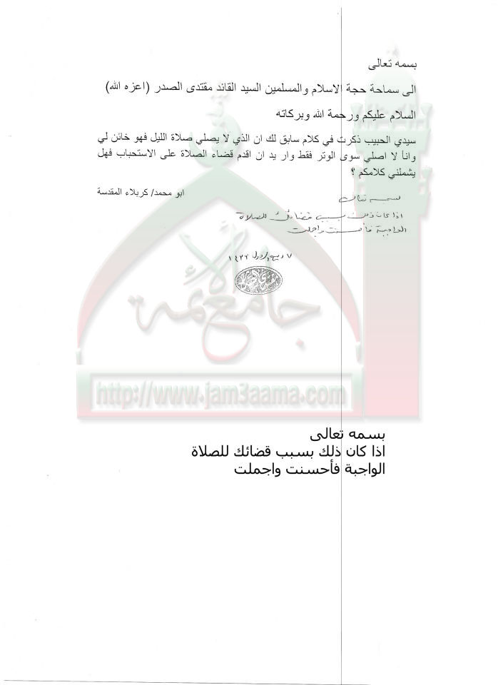 تقديم قضاء الصلوات على صلاة الليل استفتاء السيد القائد مقتدى الصدر اعزه الله 1-2-2012