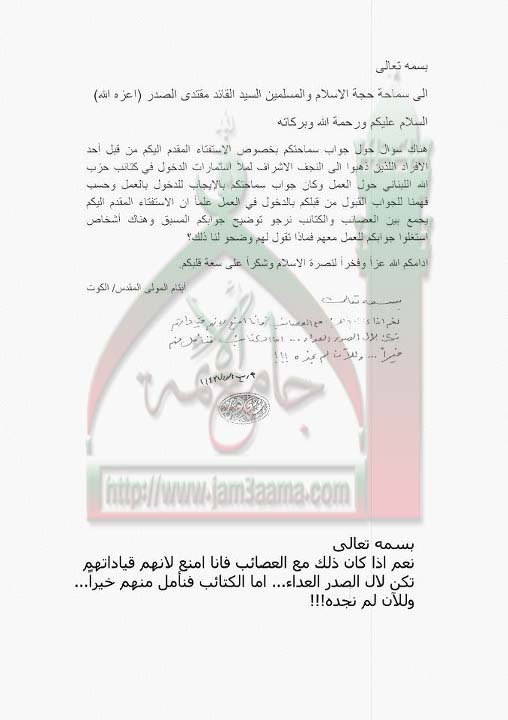 العمل مع كتائب حزب الله استفتاء السيد القائد مقتدى الصدر اعزه الله 3-2-2012