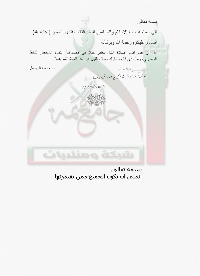 مدى ابتعاد تارك صلاة الليل عن الخط الشريف استفتاء للسيد القائد بتاريخ 2012/2/6