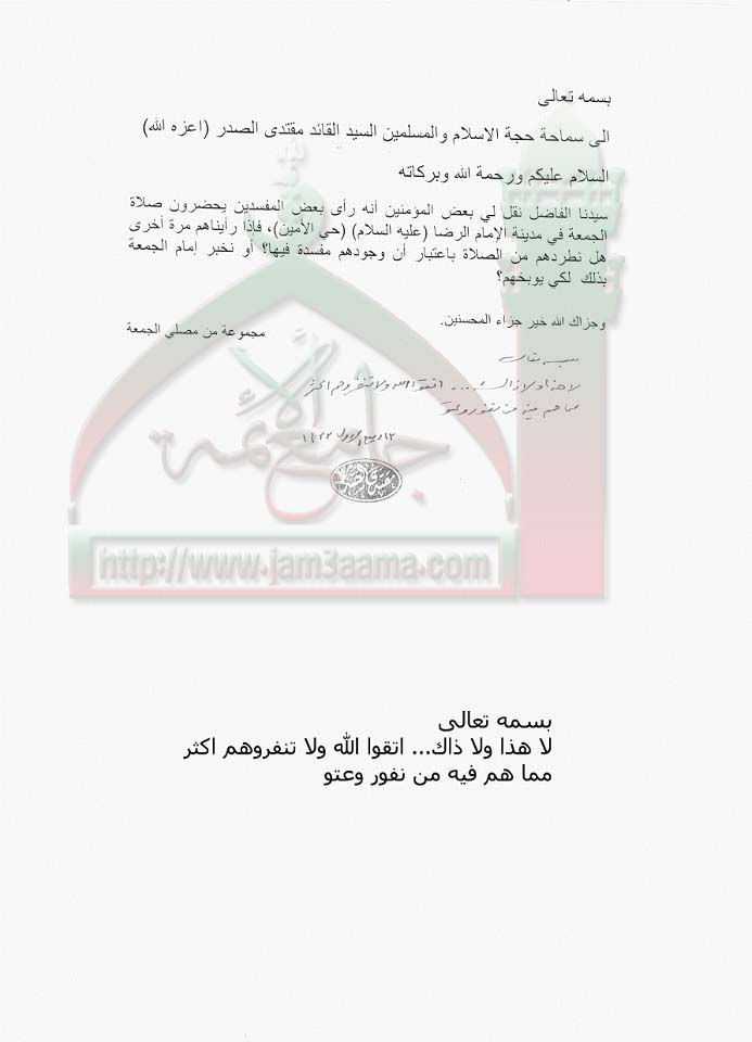حضور بعض المفسدين لصلاة الجمعة استفتاء السيد القائد مقتدى الصدر اعزه الله 7-2-2012