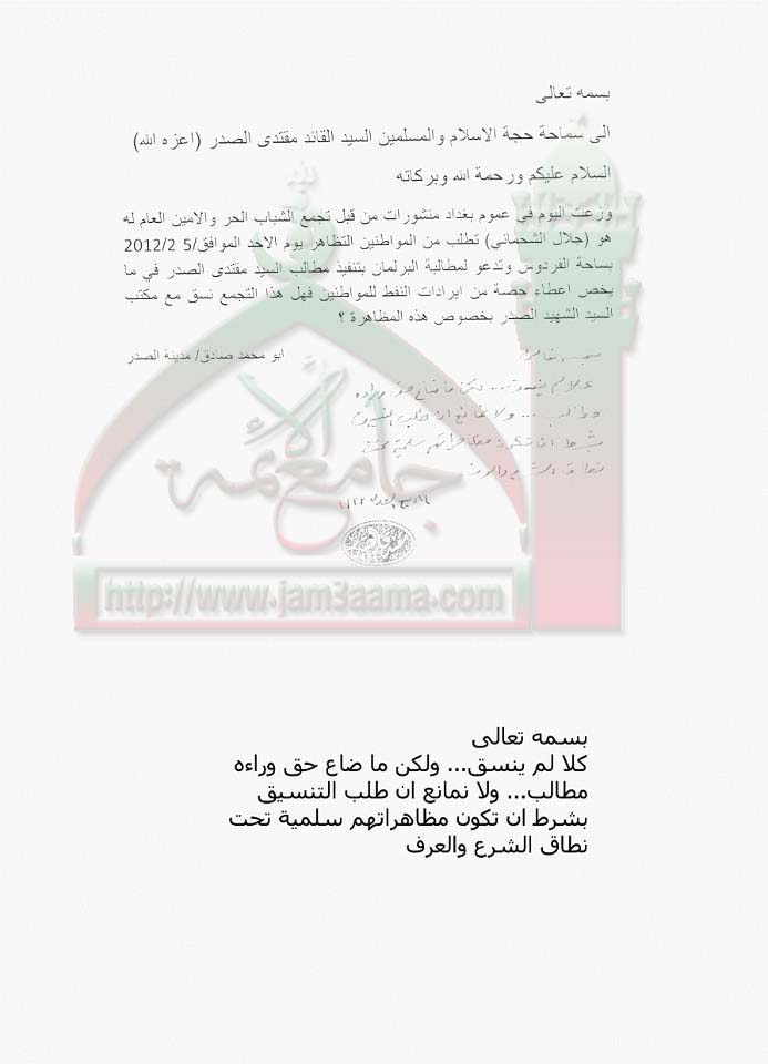 التظاهرة التي دعا اليها ( جلال الشحماني ) وتنسيقها مع مكتب السيد الشهيد استفتاء السيد القائد مقتدى الصدر اعزه الله 8-2-2012