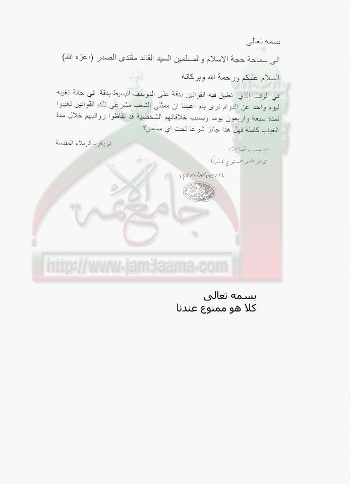 استلام ممثلي الشعب رواتبهم كاملة مع تغيبهم بسبب خلافاتهم الشخصية لمدة سبعة واربعون يوما!! استفتاء السيد القائد مقتدى الصدر اعزه الله 8-2-2012