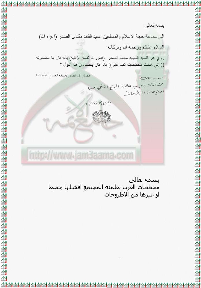 القصد من مقولة السيد الشهيد ( اني هدمت مخططات الف عام ) استفتاء السيد القائد مقتدى الصدر اعزه الله 11-2-2012