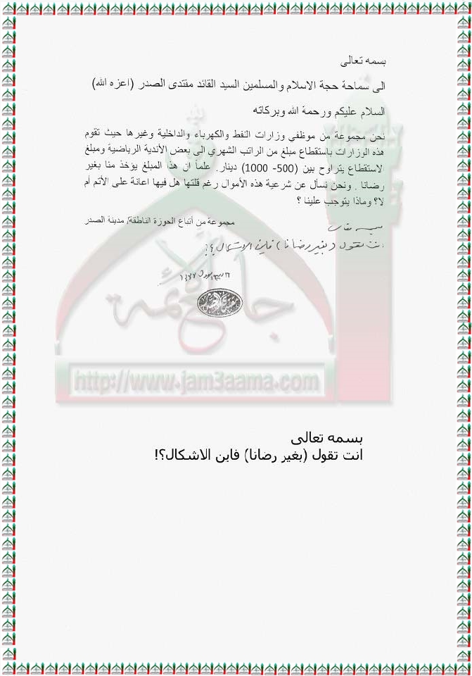 استقطاع مبلغ من الراتب الشهري للموظفين الى بعض الاندية الرياضية استفتاء السيد القائد مقتدى الصدر اعزه الله 11-2-2012