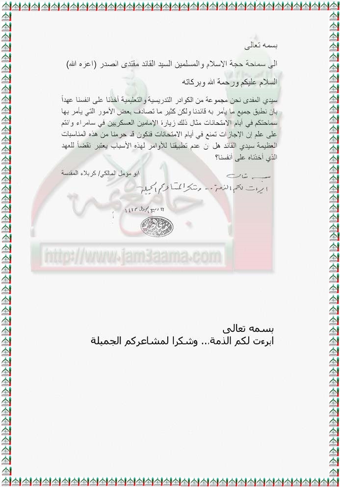 الكوادر التدريسية وعدم ذهابها الى الزيارات التي يامر بها سماحته بسبب الامتحانات استفتاء السيد القائد مقتدى الصدر اعزه الله 11-2-2012