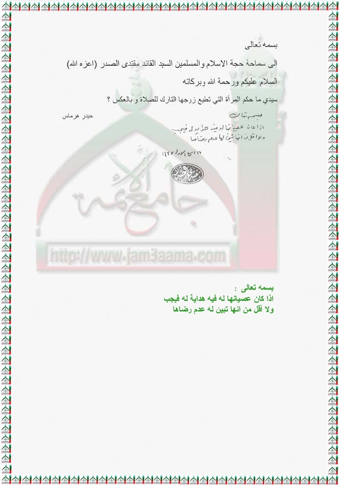 حكم المرأة التي تطيع زوجها التارك للصلاة وبالعكس استفتاء السيد القائد مقتدى الصدر اعزه الله 11-2-2012