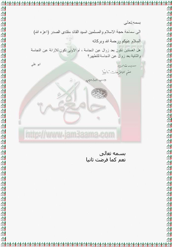 ازالة عين النجاسة استفتاء السيد القائد مقتدى الصدر اعزه الله 11-2-2012
