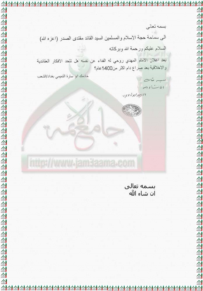 اتحاد الافكار العقائدية والاخلاقية بعد اعلان الامام المهدي عليه السلام عن نفسه استفتاء السيد القائد مقتدى الصدر اعزه الله 11-2-2012