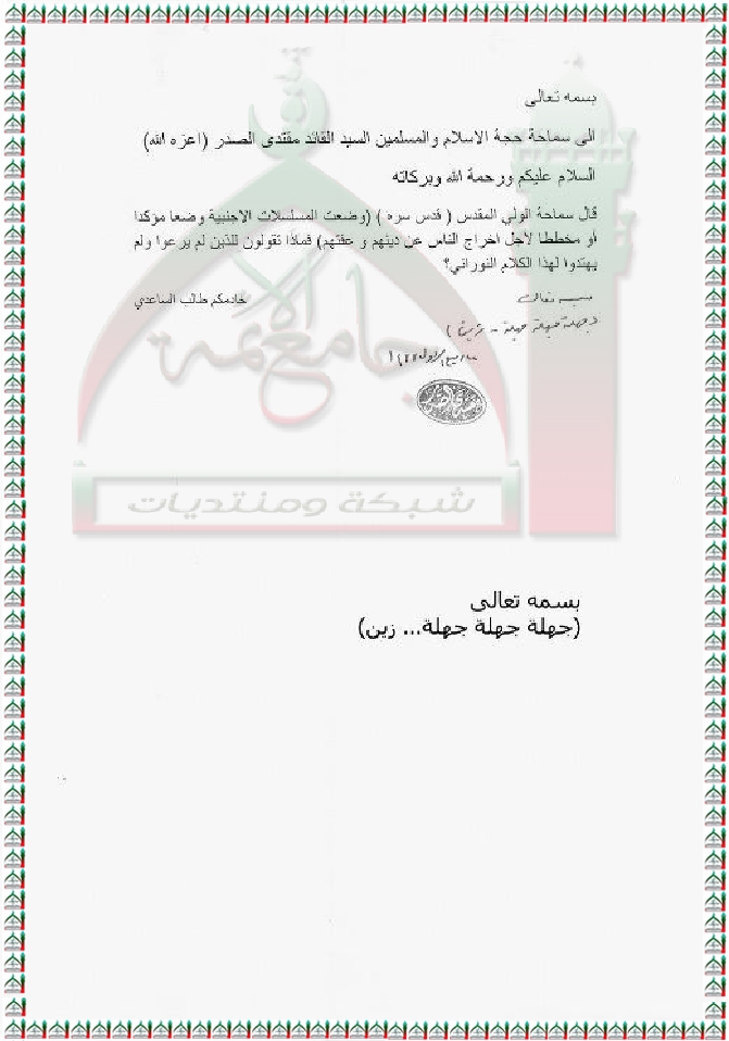قول السيد المولى ( المسلسلات الاجنبية مخطط لاخراج الناس عن دينهم ) استفتاء السيد مقتدى الصدر اعزه الله 16-2-2012