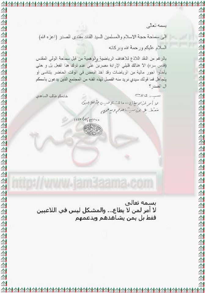 عدم ترك الرياضة المحرمة وأخذ الاجرة عليها استفتاء السيد القائد مقتدى الصدر اعزه الله 16-2-2012
