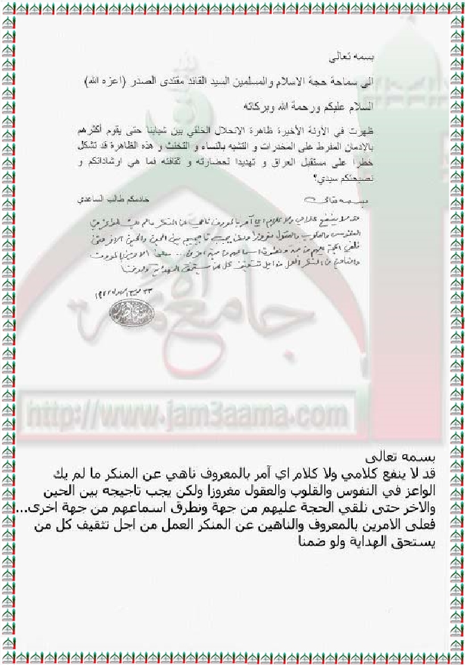 انتشار ظاهرة الانحلال الخلقي بين الشباب استفتاء السيد القائد مقتدى الصدر اعزه الله 16-2-2012