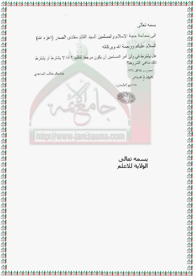 الاعلمية شرط ولي امر المسلمين استفتاء السيد القائد مقتدى الصدر اعزه الله 16-2-2012