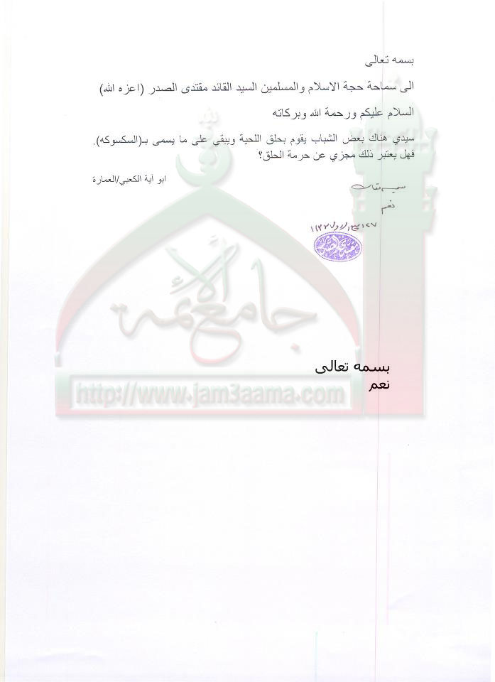 حلق اللحية مع ابقاء ما يسمى عرفا السكسوكه استفتاء السيد القائد مقتدى الصدر أعزه الله 22-2-2012