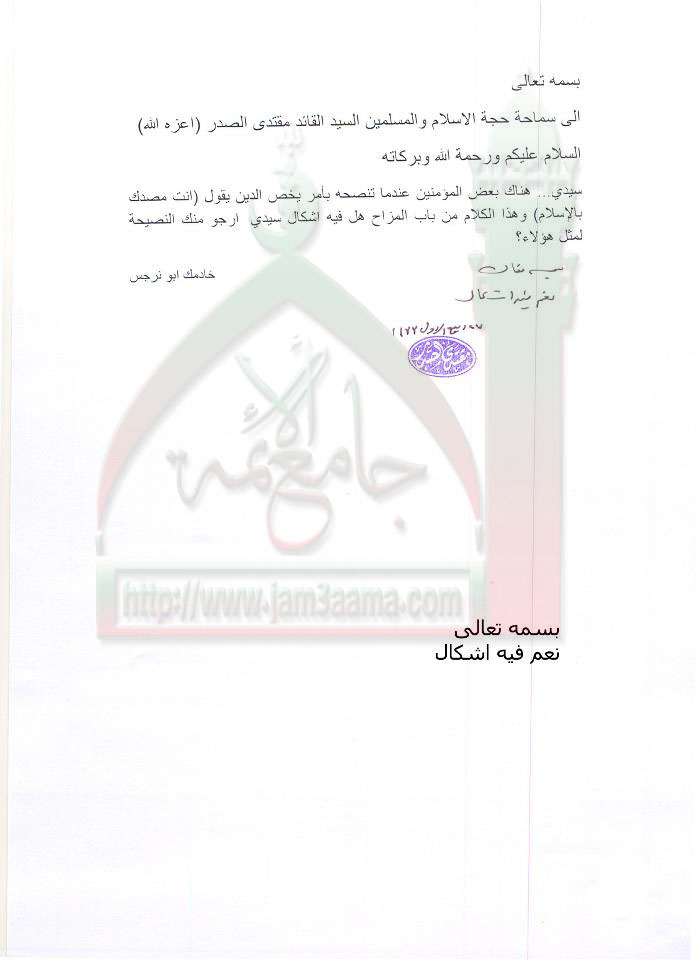 مقولة انته مصدك بالاسلام عند المزاح استفتاء السيد القائد مقتدى الصدر أعزه الله 22-2-2012