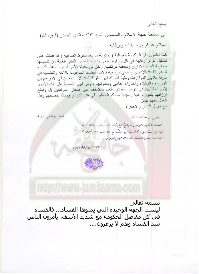 دائرة المفتش العام وتسترها على الفساد استفتاء السيد القائد مقتدى الصدر أعزه الله 22-2-2012