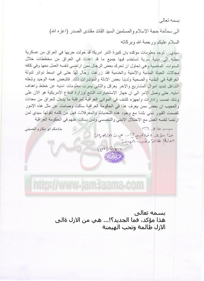 العمل الامني والتجسسي لصالح الاحتلال من خلال دوائر الدولة استفتاء السيد القائد مقتدى الصدر اعزه الله 26 - 2 - 2012