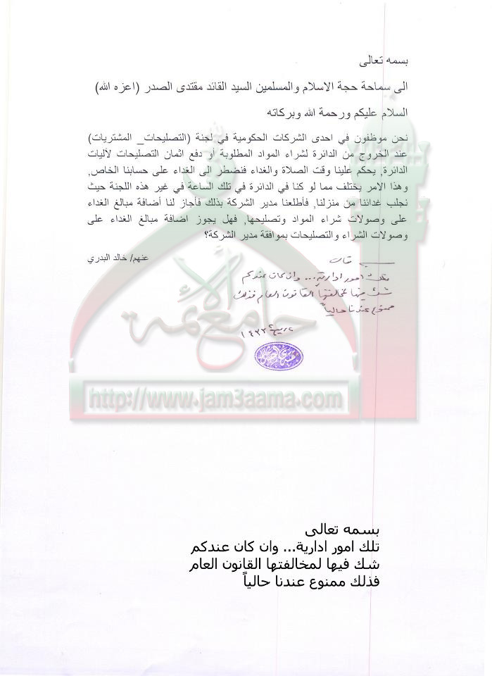 اضافة مبالغ الغداء على وصولات الشراء للجنة المشتريات استفتاء السيد القائد مقتدى الصدر اعزه الله 26 - 2 - 2012