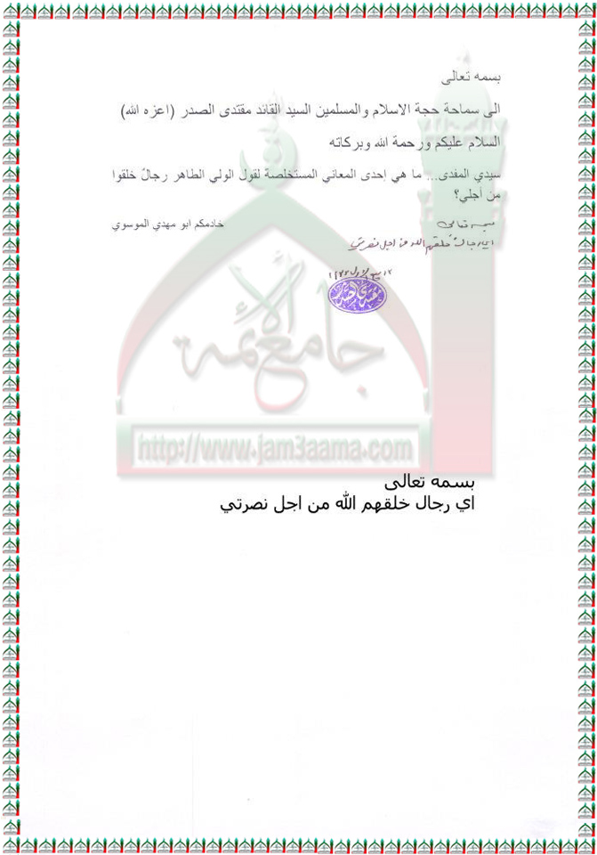 المعاني المستخلصة لقول الولي الطاهر"رجال خلقوا من اجلي" استفتاء السيد القائد مقتدى الصدر اعزه الله 29 - 2 - 2012