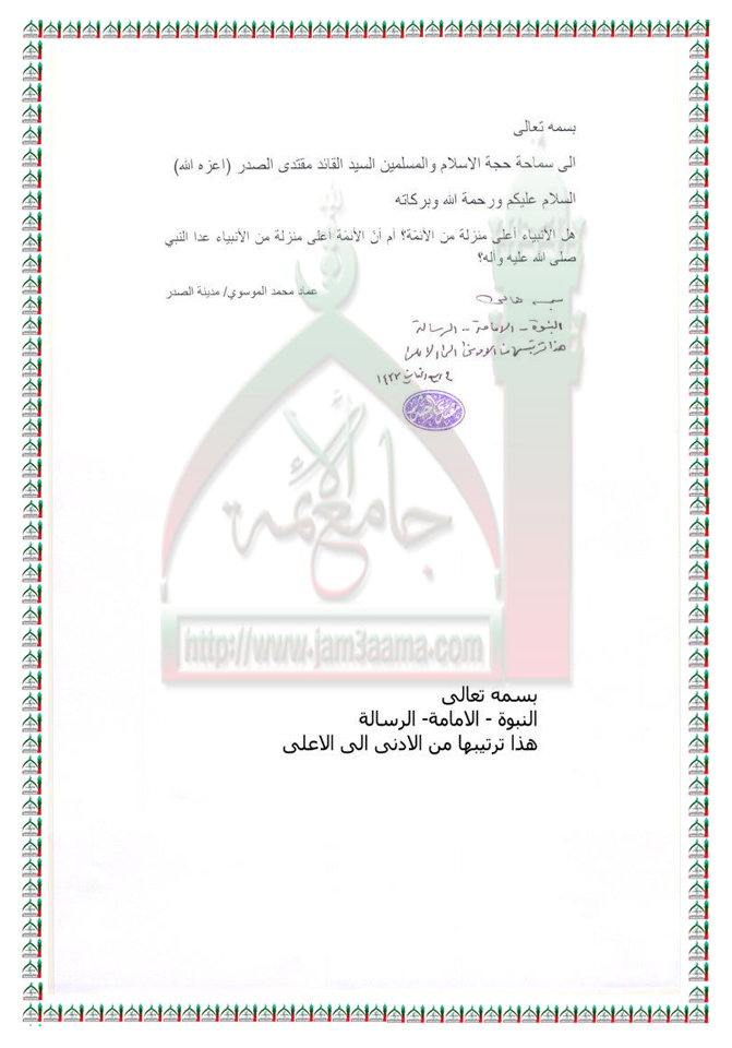 افضلية الرسالة على الامامة والنبوة استفتاء السيد القائد مقتدى الصدر اعزه الله 29 - 2 - 2012