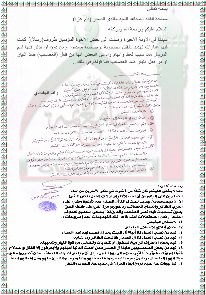 وصول رسائل تهديد بالقتل لبعض المؤمنين استفتاء السيد القائد مقتدى الصدر 1 _ 3 _ 2012
