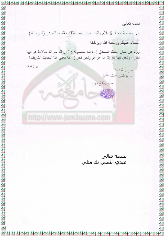 معنى القول الوارد عن الامام الصادق ع "ان لنا مع الله حالات...." استفتاء السيد القائد مقتدى الصدر اعزه الله 2 - 3 - 2012