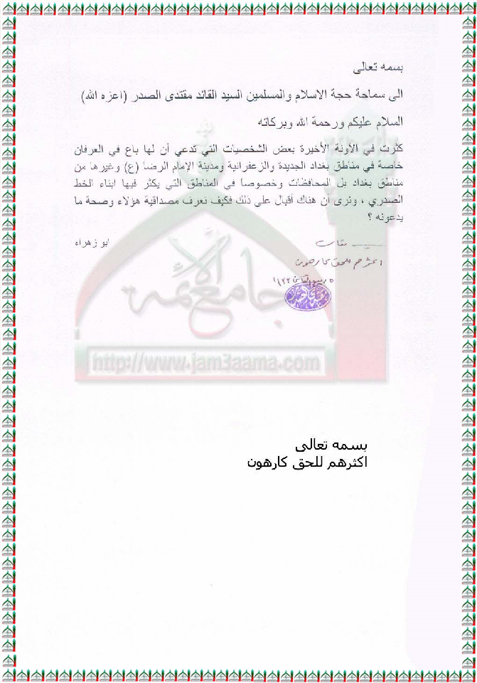 ما يدّعيه البعض من العرفان في بغداد والمحافظات استفتاء السيد القائد مقتدى الصدر اعزه الله 2 - 3 - 2012