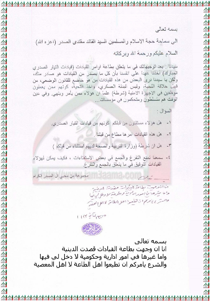 انا وجّهت بطاعة القيادات الدينية واما غيرها لا دخل لي فيها استفتاء السيد القائد مقتدى الصدر اعزه الله 2 - 3 - 2012