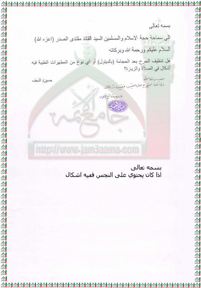 تنظيف الجرح الناتج من الحجامة بالمطهرات الطبية استفتاء السيد القائد مقتدى الصدر اعزه الله 3 - 3 - 2012