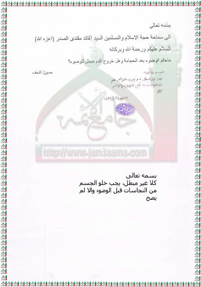 حكم الوضوء بعد الحجامة استفتاء السيد القائد مقتدى الصدر اعزه الله 3 - 3 - 2012