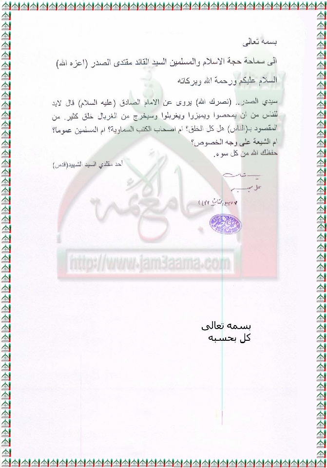 القول الوارد عن الامام الصادق ع "لابد للناس من ان يمحصوا ويغربلوا وسيخرج من الغربال خلق كثير "استفتاء السيد القائد مقتدى الصدر اعزه الله 3 - 3 - 2012