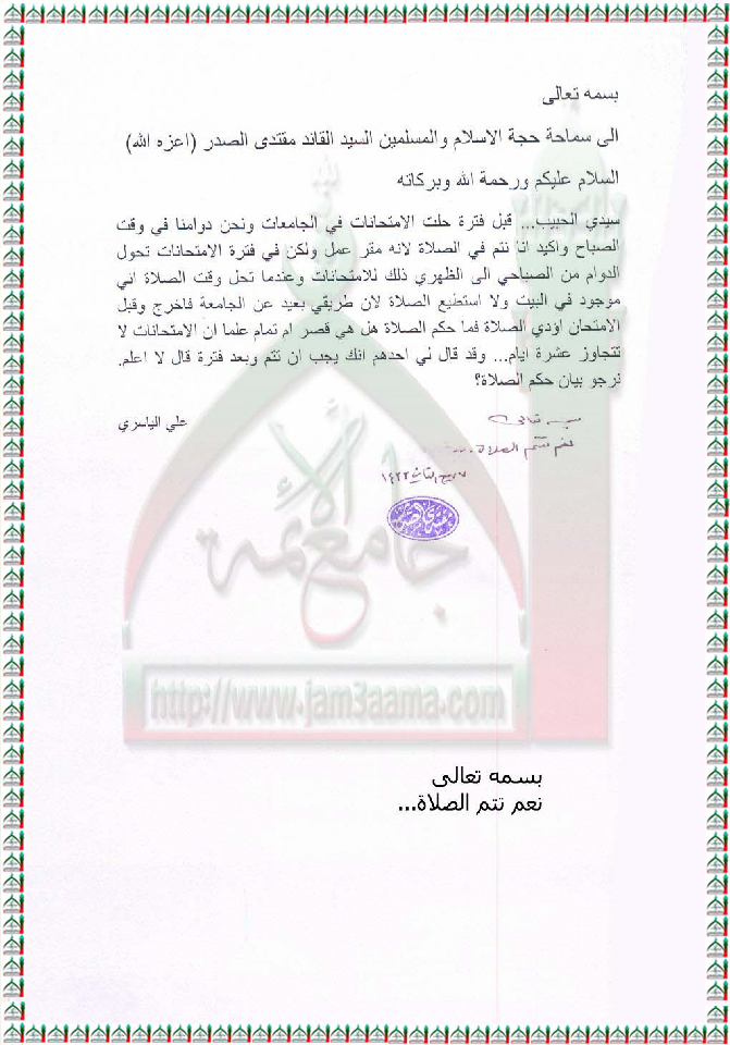 من احكام صلاة القصر والتمام لطلبة المحافظات استفتاء السيد القائد مقتدى الصدر اعزه الله 3 - 3 - 2012